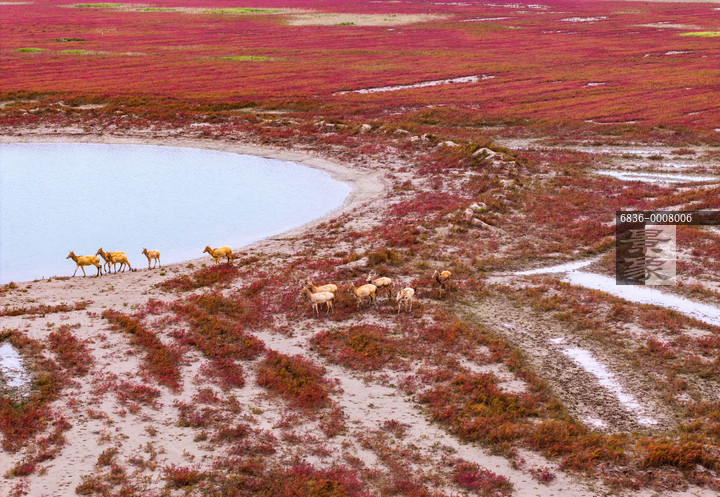 图片标题:     江苏盐城:湿地“红地毯”上麋鹿欢