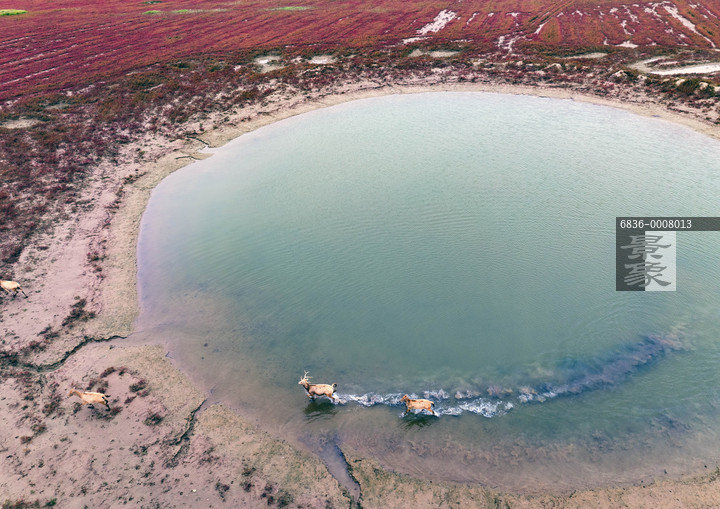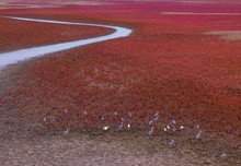 图片标题: 江苏盐城:湿地“红地毯”上麋鹿欢