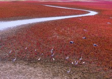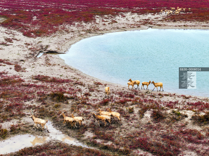 图片标题:     江苏盐城:湿地“红地毯”上麋鹿欢