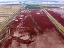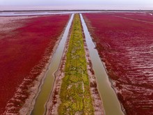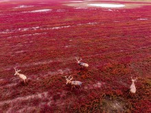 图片标题: 江苏盐城:湿地“红地毯”上麋鹿欢