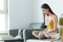 图片标题: 拿着咖啡的时尚青年女人打电话