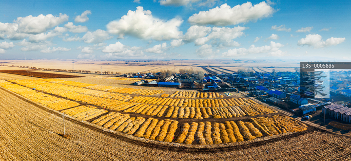 图片标题: 东北乡村铺满玉米的大地村庄