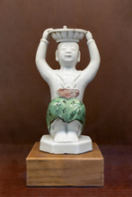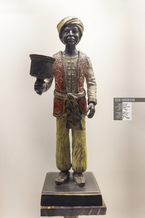 图片标题: 世界古灯馆-铜彩绘穿红坎肩的少年捧灯烛台-泰国-距今约100年