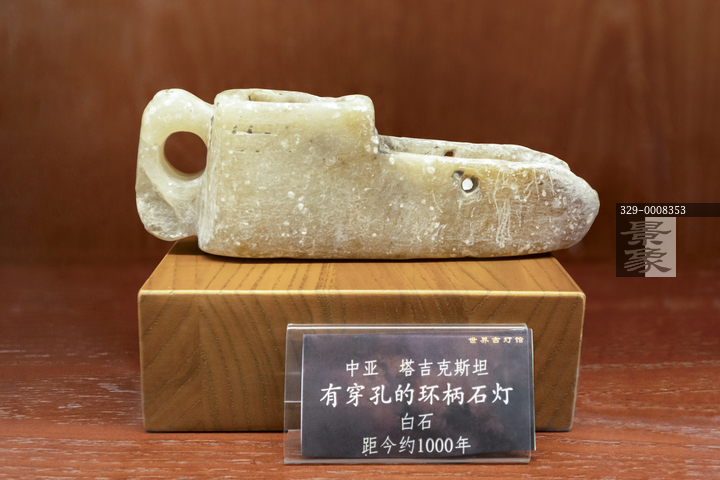 图片标题: 世界古灯馆-白石有穿孔的环柄石灯-中亚-塔吉克斯坦-距今约1000年