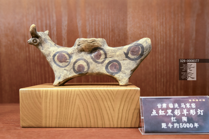 图片标题: 世界古灯馆-红陶点红黑彩羊形等-甘肃临洮马家窑-距今约5000年