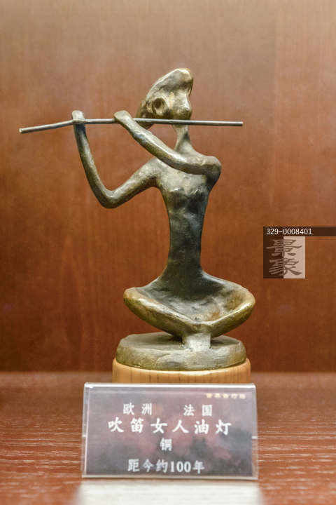 图片标题: 世界古灯馆-铜吹笛女人油灯-法国-距今约100年