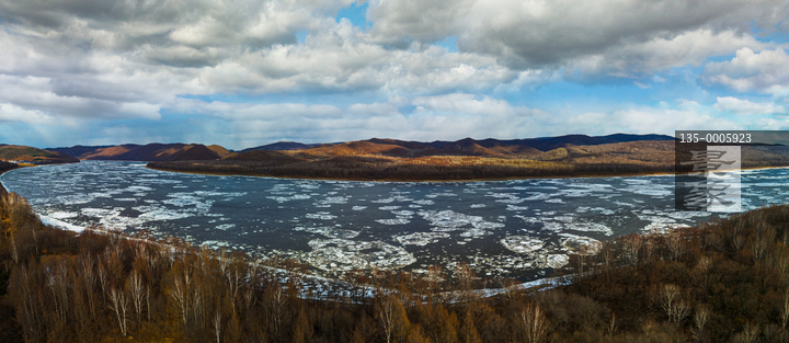 图片标题: 航拍萝北金满屯黑龙江流冰风光