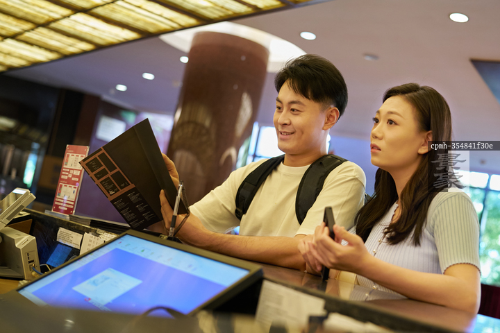图片标题: 青年伴侣在酒店前台咨询