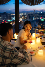 图片标题: 享用下午茶的一家三口使用手机拍照
