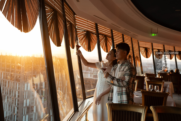 图片标题: 空中餐厅内品红酒的青年伴侣