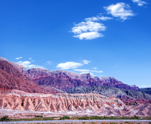 图片标题: 新疆阿克苏到喀什S13三莎高速公路边的五彩天山山脉