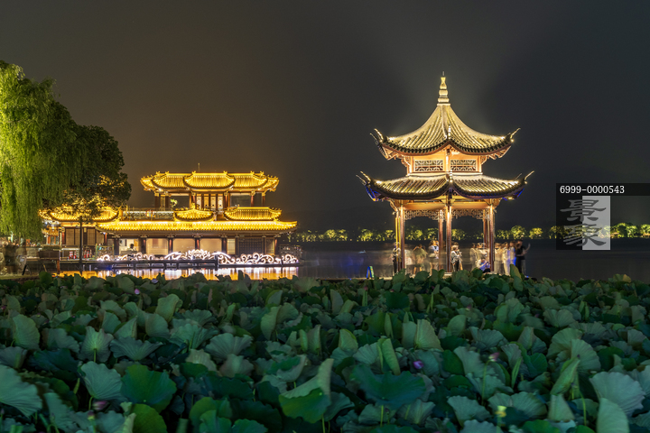 图片标题: 杭州西湖集贤亭晚霞日落夜景