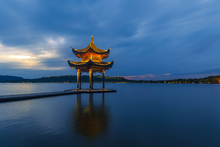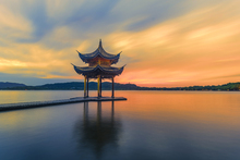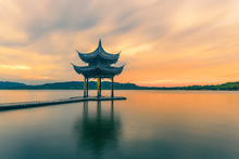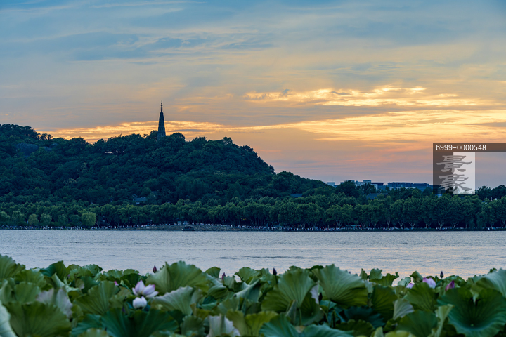 图片标题: 傍晚时分的杭州西湖宝石山保俶塔断桥与晚霞