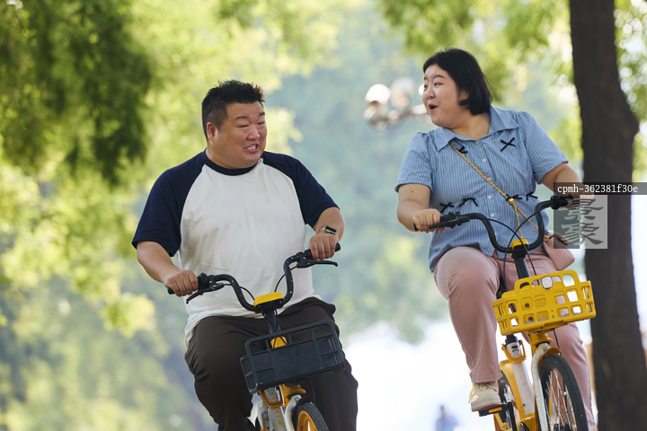 图片标题: 户外骑共享单车的青年胖子情侣