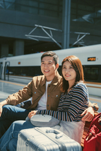 图片标题: 候车大厅内拉着皮箱赶路的两位青年商务人士