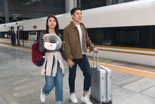 图片标题: 候车大厅内拉着皮箱赶路的两位青年商务人士
