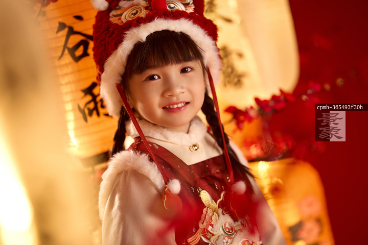 图片标题: 可爱的小女孩带着虎头帽过新年
