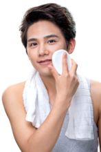 图片标题: 快乐的年轻男人拿着毛巾照镜子