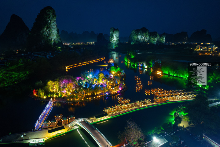 图片标题:     中国广西阳朔县游客坐竹筏夜游遇龙河