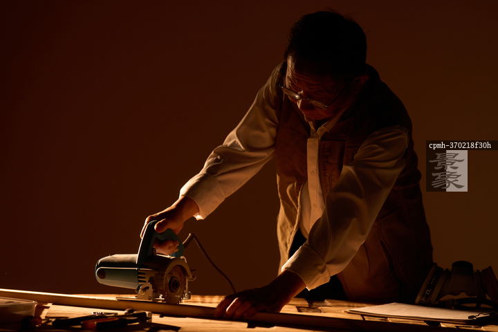 图片标题: 一名木工工人裁切木板