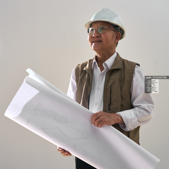 图片标题: 一名老年工程师研究施工图纸
