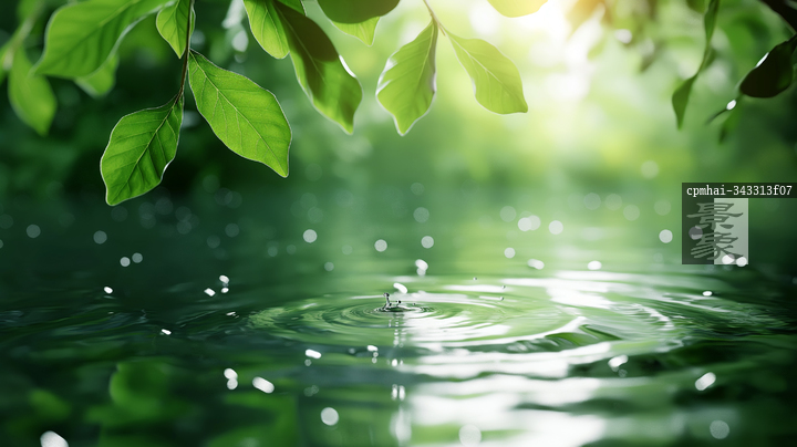 图片标题:     生机盎然的户外景象,绿叶悬挂在角落,水面波光粼粼,展现出令人心旷神怡的自然之美