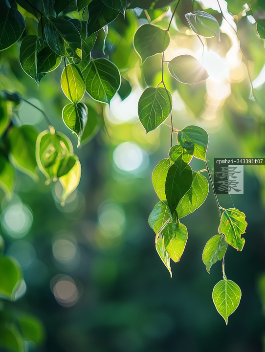 图片标题: 阳光照耀下的绿叶,展现自然的生机和美丽