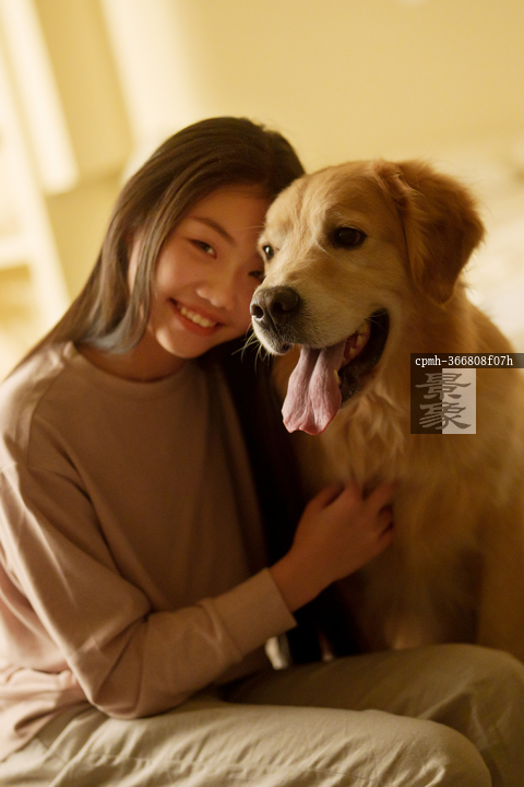 图片标题: 一位快乐女孩和宠物狗玩耍