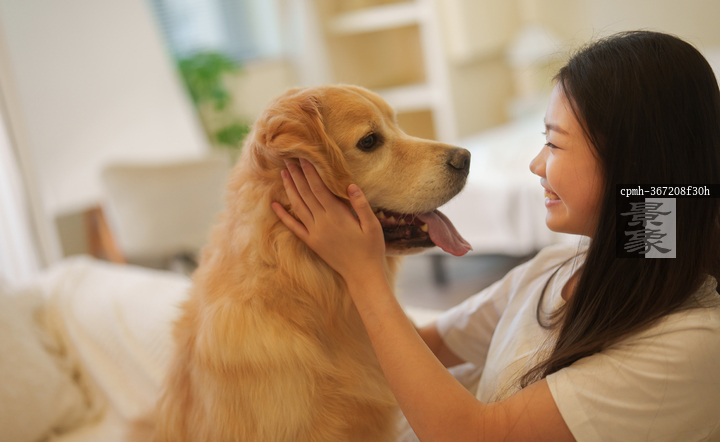 图片标题: 一位快乐女孩和宠物狗玩耍