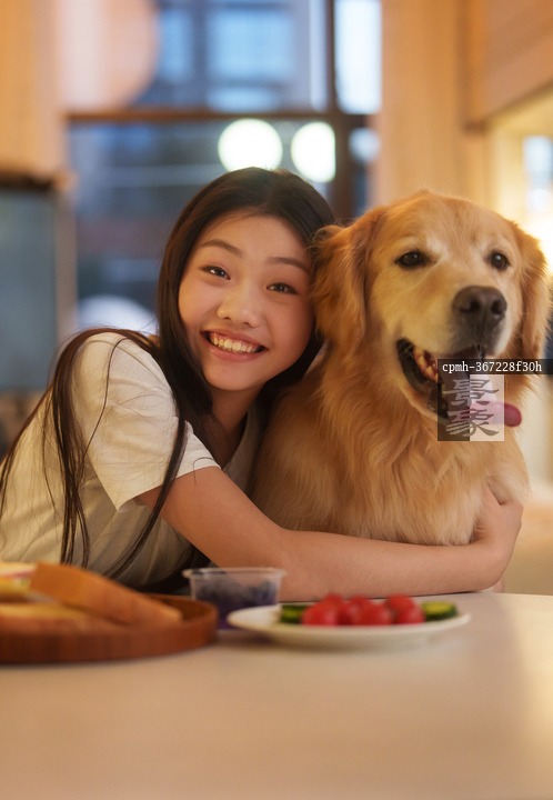 图片标题: 餐厅内一位快乐女孩和宠物狗玩耍