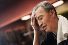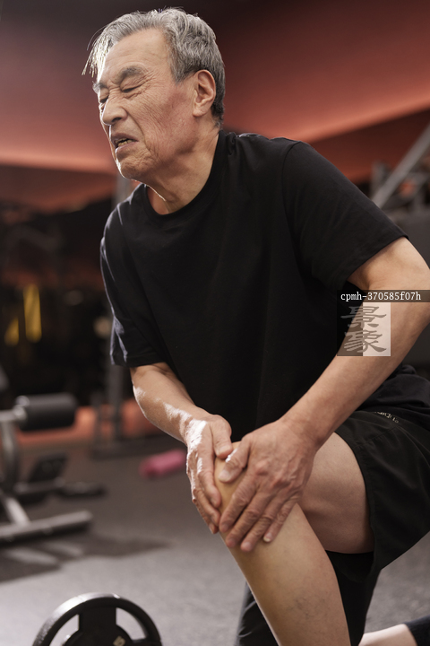图片标题: 在健身房里锻炼的一位老年人腿部受伤