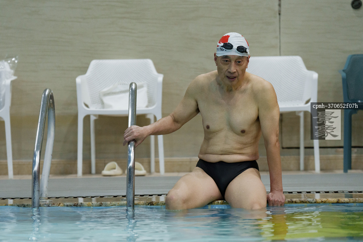 图片标题:     一位老年男性坐在泳池边休息