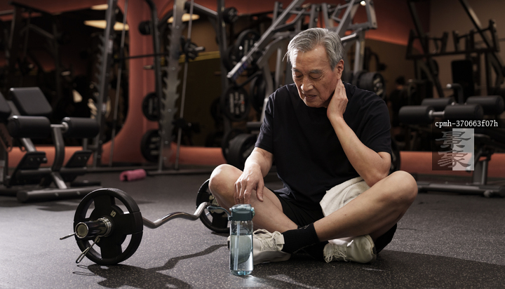 图片标题: 在健身房里锻炼的一位老年人身体疲劳
