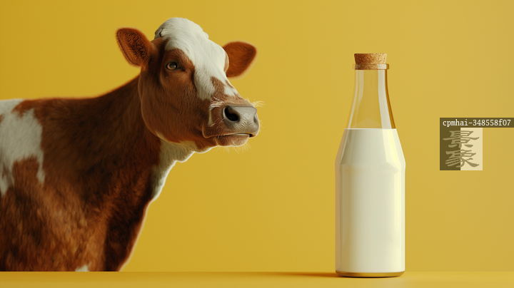 图片标题: 奶牛与牛奶瓶的黄色背景