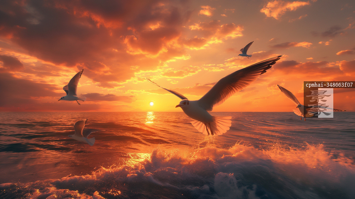 图片标题:     海鸟翱翔于夕阳海面