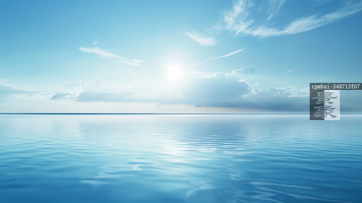 图片标题: 平静蓝色背景下的海洋日出景象,带来宁静祥和的氛围