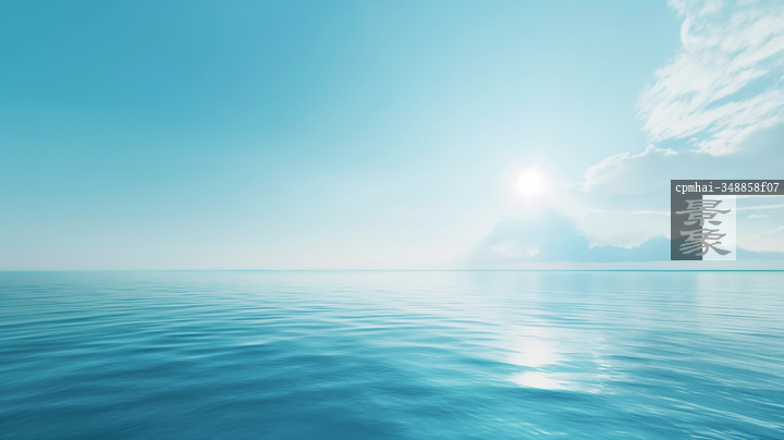 图片标题: 平静蓝色背景下的海洋日出景象,带来宁静祥和的氛围