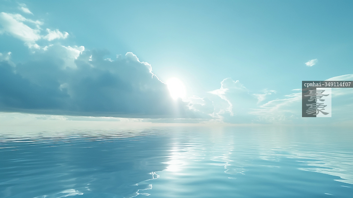 图片标题: 平静蓝色背景下的海洋日出景象,带来宁静祥和的氛围