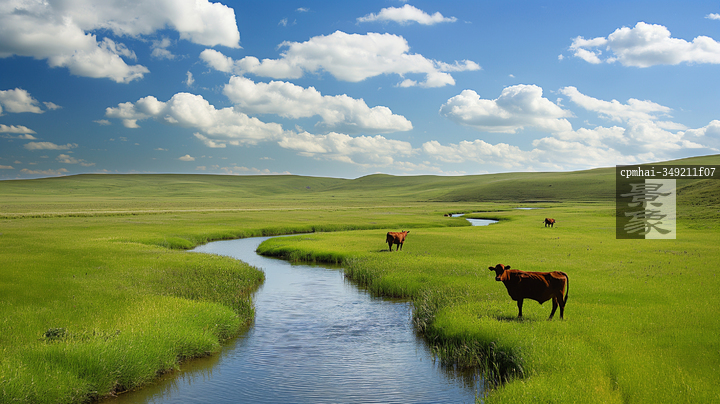 图片标题: 广袤草原上的宁静牛群与蓝天白云相映成趣
