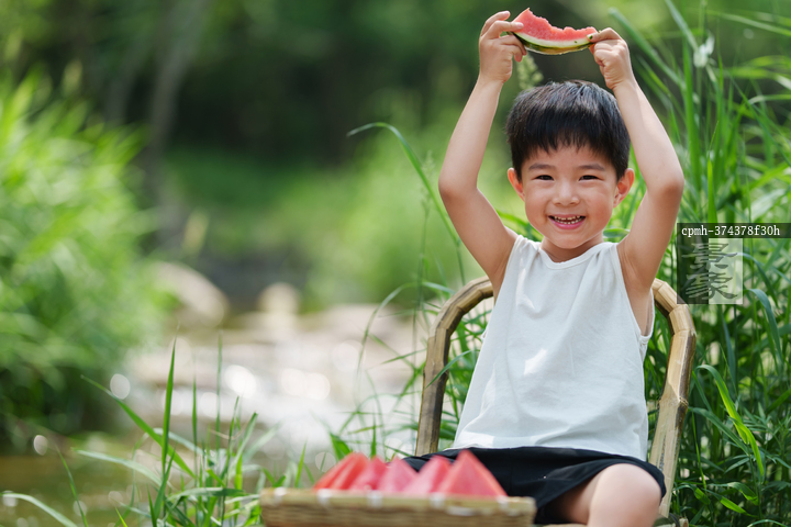 图片标题: 一位小女孩坐在河边休息吃西瓜