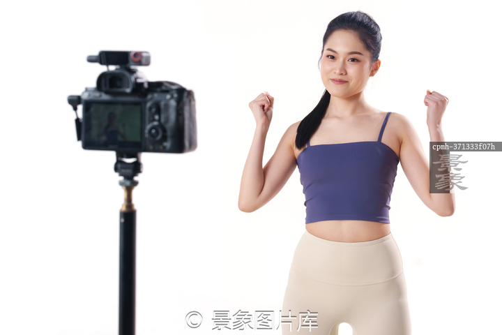 图片标题: 年轻的亚洲女性在做在线运动健身教学