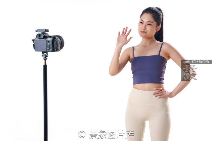 图片标题: 年轻的亚洲女性在做在线运动健身教学