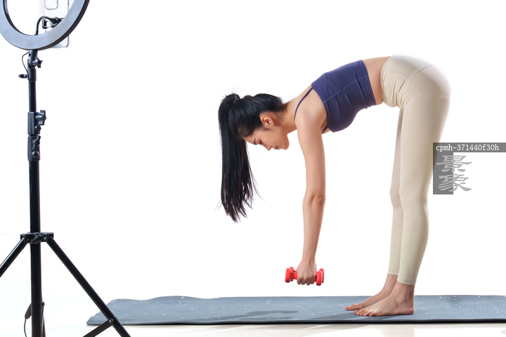 图片标题: 年轻的亚洲女性在做在线运动健身教学