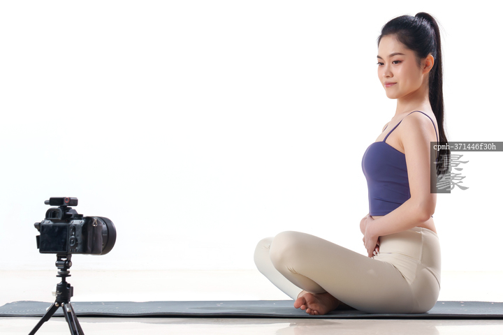 图片标题: 年轻的亚洲女性在做在线运动健身教学