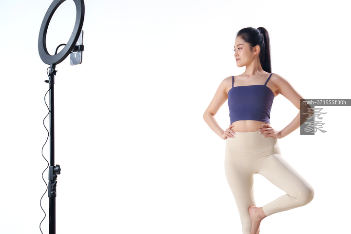 图片标题: 年轻的亚洲女性在做在线运动健身教学