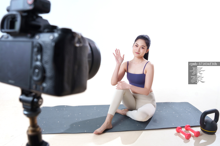 图片标题: 年轻的亚洲女性在做在线运动健身教学
