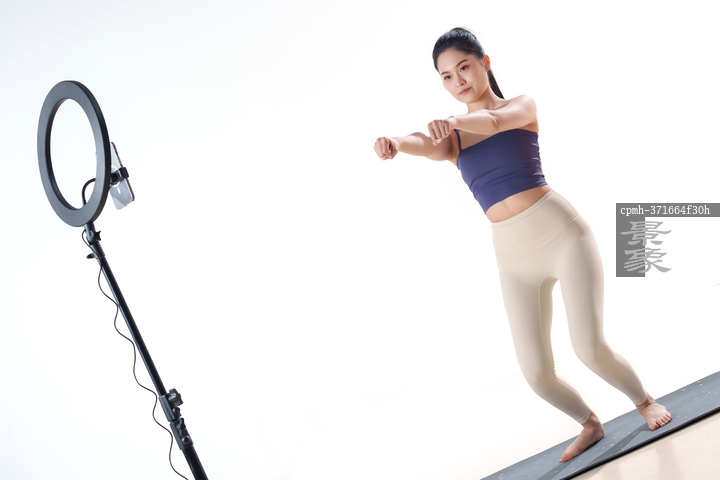 图片标题: 年轻的亚洲女性在做在线运动健身教学