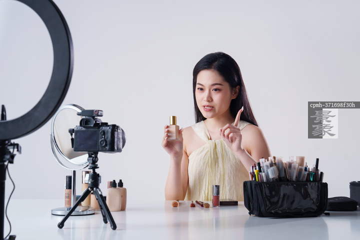 图片标题: 年轻女主播直播美容产品