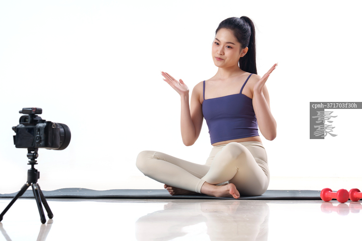 图片标题: 年轻的亚洲女性在做在线运动健身教学
