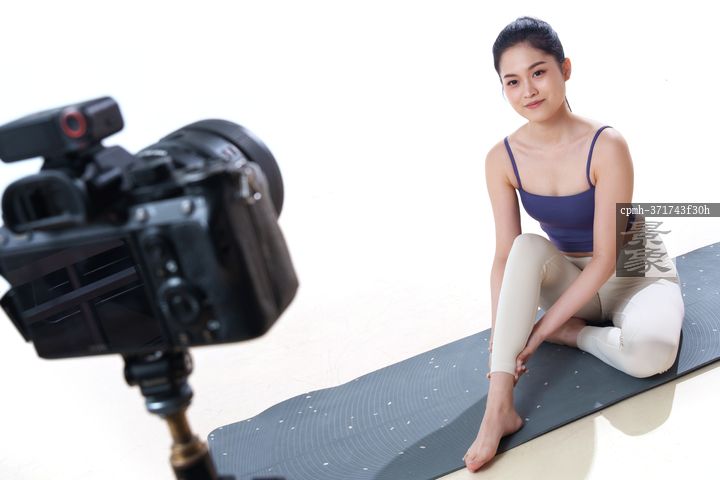 图片标题: 年轻的亚洲女性在做在线运动健身教学